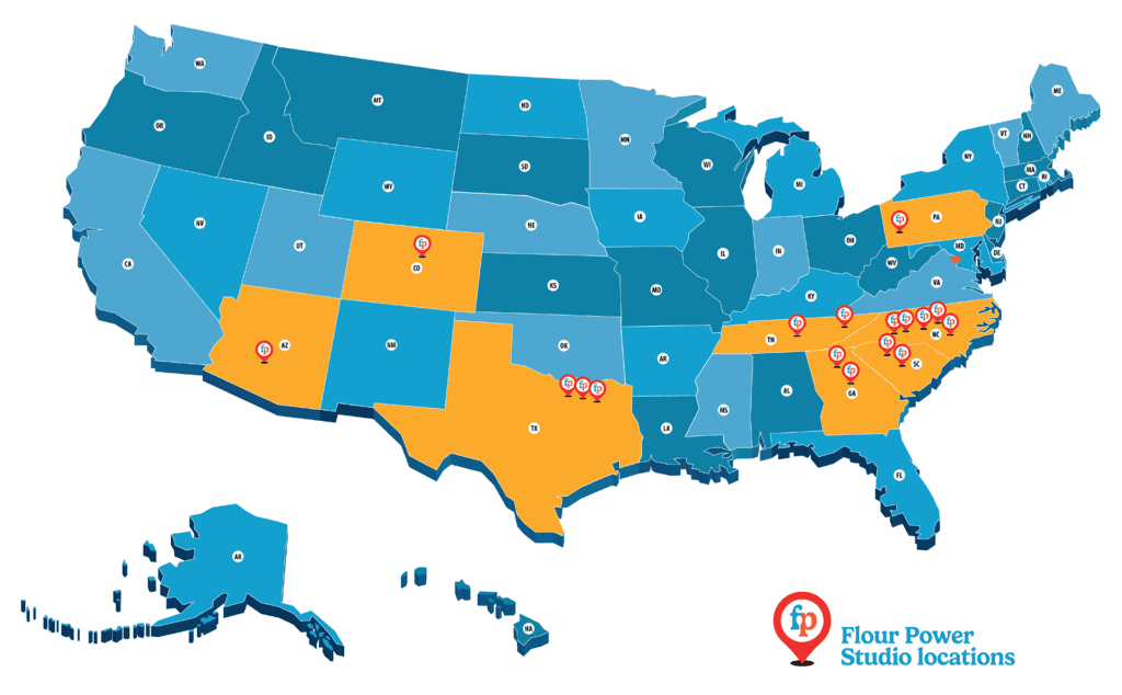 Time fries when you’re having fun. Walk through the door of a Flour Power Studio and you’ll feel welcome. Our signature studios are inviting and casual spaces to learn and celebrate all things culinary. Our offerings include: Birthday Parties, Weekly Classes, Camps, Adult Classes, Corporate Events, Kids’ Night Out Events, and Etiquette Classes!